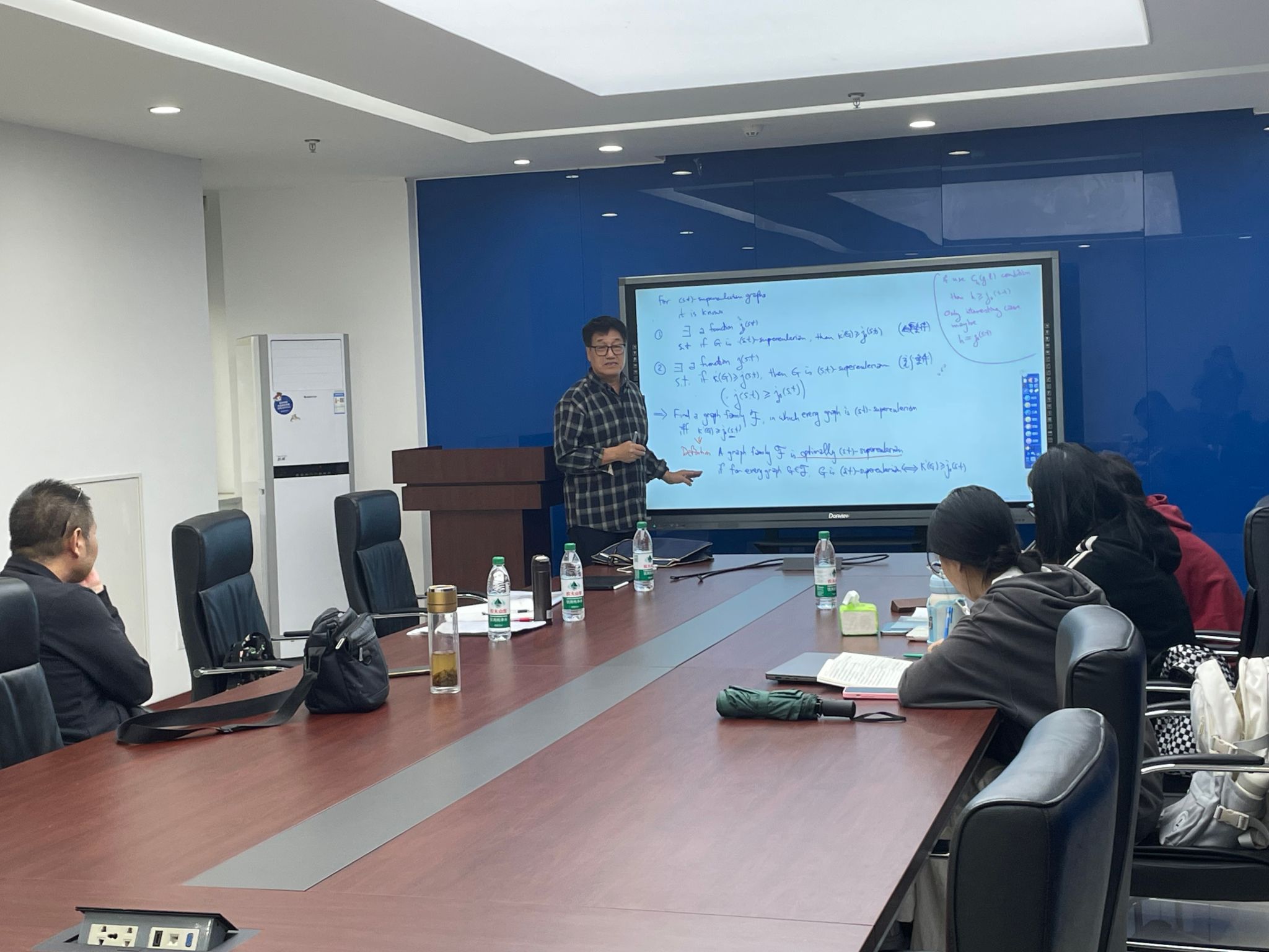 报告中,赖虹建教授首先介绍了(s,t)-supereulerian problem和nontrivial k-supereulerian problem的背景及相互关系;然后重点介绍了(s,t)-supereulerian problem的研究现状,并给出一个图族optimally (s, t)-supereulerian family,这个问题的研究对复杂网络等方面研究具有重要现实意义;最后赖虹建教授就(s,t)-supereulerian problem和nontrivial k-supereulerian problem为我院师生后续研究提出了建议。报告结束后,赖虹建教授一一解答了师生们提出的问题。
