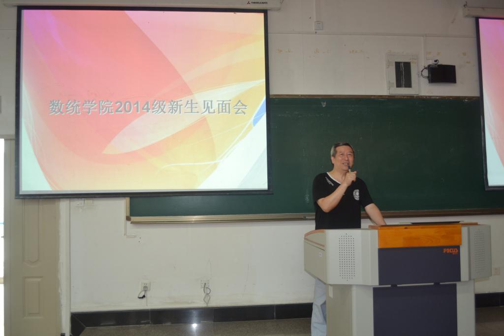 会议首先由丁院长讲话,他对加入数统大家庭的新生表示热烈欢迎,并为大家介绍了数统学院的专业特色,也对我院近年来所获奖励情况进行介绍。接着,喻书记提出要求同学们正确树立自己的人生目标,合理规划自己大学四年,注重学习、工作、娱乐的相结合,做一名全面发展的优秀大学生。随后,易书记和陈教授都重点强调了希望同学们在学校生活中养成良好的生活习惯,努力加强自身修养和提高整体素质,并鼓励大家积极参加“数学建模”等专业学科类比赛,争取收获更多荣誉。最后 14级金数班辅导员赵娟娟老师向大家作了自我介绍,辅导员李晓明老师为大家简单讲述了新学期开始时的注意事项,并希望在接下来时间里一起共同努力,将 14级建设的更加美好。会议到此圆满结束。