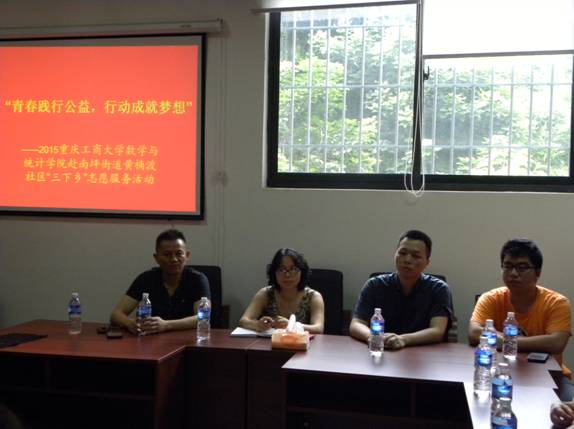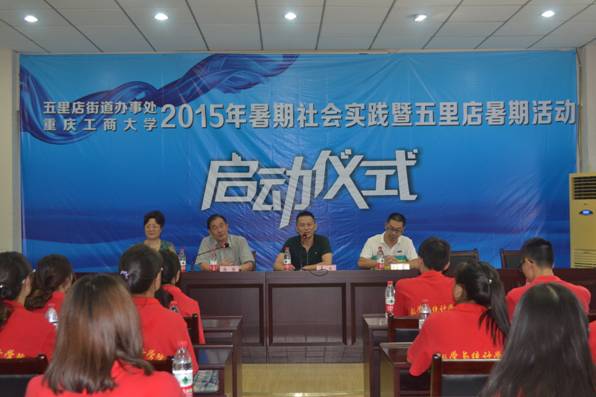 下午,赴五里店志愿服务活动启动仪式在江北区五里店街道举行。江北区关工委常务副主任杨辉、五里店社区社会服务中心石勇主任、五里店街道妇联唐旭主席、重庆工商大学党总支副书记易忠教授及全体三下乡实践的队员出席了开幕式。会议由石勇主任主持。石勇主任对志愿者们致以了亲切的问候,指出“三下乡”活动是大学生运用知识,施展才华,磨练意志的一种有效途径,希望同学们能够在实践工作中增长才干、锻炼能力,鼓励大家将这种无私奉献的志愿精神发扬传递下去。