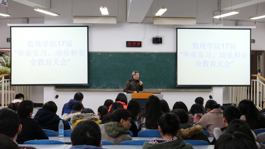 2016年12月2日下午14:30,数统学院2017届应届生“毕业实习、毕业论文动员和安全教育大会”于慧智楼90226教室召开。我院院长丁宣浩教授、书记喻永红副教授、副书记易忠教授、副院长叶勇副教授、数学系副主任龙宪军教授、统计学系主任李勇副教授、统计学系副主任杨炜明副教授、教学办陈琳红老师和学团办吴卫老师出席此次会议,2017届230名毕业生参与了此次会议,会议由吴卫老师主持。