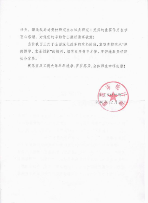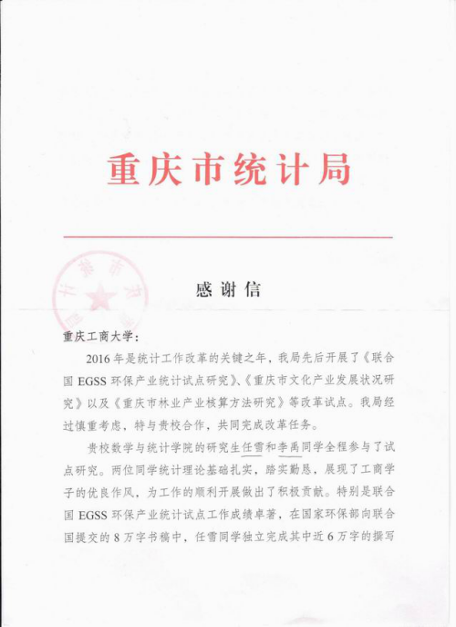 近日,重庆市统计局给我校发来感谢信,赞扬我校研究生教育的优秀成效,感谢我校统计学研究生在产业统计试点改革研究中的倾力付出和突出贡献。