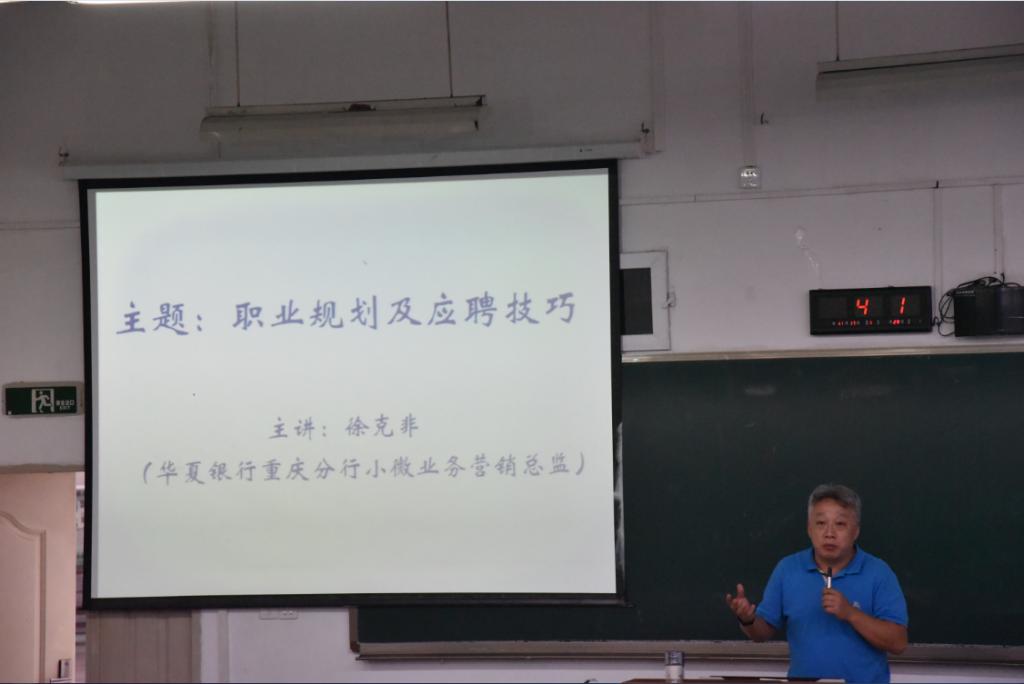 2017年11月17日下午14:30,在慧智楼90309教室,我校1989届数学专业校友、华夏银行重庆分行小微业务营销总监徐克非先生应邀为我院学生作了关于大学生职业规划的讲座。讲座由学院党总支喻书记主持,2014级全体学生参加。