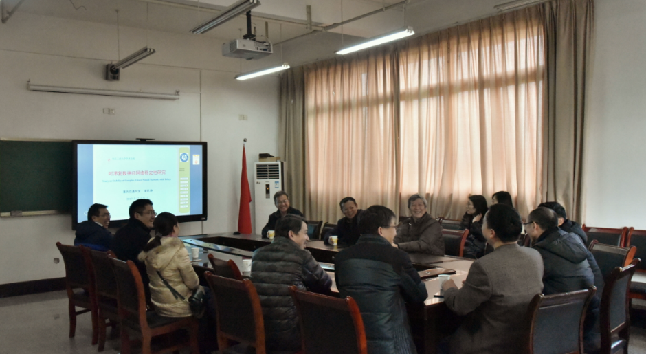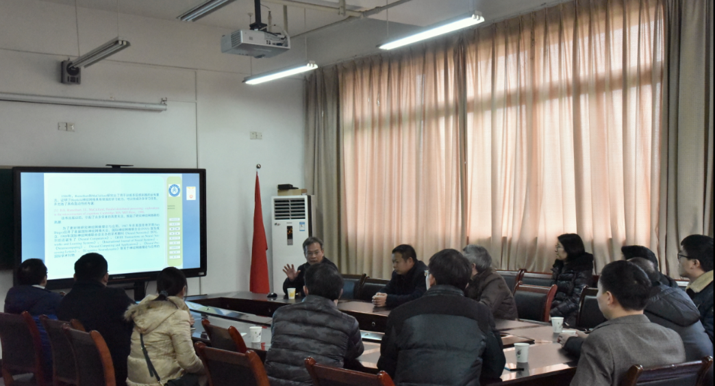 此次学术报告共分为两个主要内容,即实数神经网络稳定性研究简介和时滞复数神经网络稳定性研究。宋乾坤教授首先为大家介绍了实数神经网络稳定性的研究历程,从最初的Hopfield神经网络稳定性研究,到近三十年来各种神经网络模型被提出,实数神经网络稳定性已经得到了广泛关注。紧接着,简单介绍了国际上各类复数神经网络稳定性的研究发展成果之后,宋教授详细讲解了自己及团队在时滞复数神经网络稳定性研究方面的进展。通过矩阵的解析方法,宋教授建立了时滞复数神经网络模型,又通过分离活动函数的虚部和实部,进一步给出了网络平衡点存在唯一性和全局指数稳定性的M-矩阵判定条件。此外,宋教授还考虑了具有概率分布的变化时滞复数神经网络的稳定性问题,并将常数时滞推广为变化时滞,分别建立了变化时滞和混合时滞复数神经网络稳定性条件。最后,有关分数阶复数神经网络和四元数神经网络的稳定性问题,宋教授也同样做出了详细讲解,其中分数阶导数的定义、四元数的概念也一一被罗列出来。报告结束之际,宋教授与我院诸位教师进行了深入的学术交流,他强调做学术研究应该有自己独特的思维并努力思考出更为创新的学术研究方向。