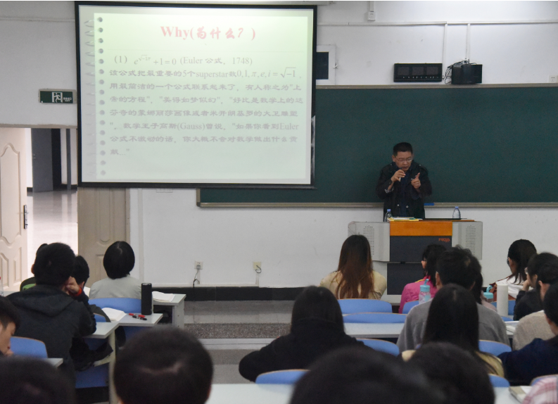 初始,张世清教授从自身经历切入,回忆了70年代本科升学率极低,读书不易的求学情况,张世清教授凭借着不屈的精神和对学习的执着,仅用了四年的时间考上了重庆大学。张教授用自己的经历引出华罗庚的数学学习之路,让同学们了解到这位“中国现代数学之父”对数学的坚持,以及为振兴中国数学而做出的种种贡献。随后张教授为同学们介绍了数学界公认的最美十大定理:欧拉公式、黎曼定理、在三维空间中存在五种正多面体、闭单位圆盘到自身的连续映射至少有一个不动点等价于不存在单位圆盘到单位圆周的单位连续映射、四色猜想等等,张教授为同学们详细的介绍了每一个公理的美丽之处,并鼓励他们要多了解数学历史,以便更加深刻的体会到数学的美丽与学习数学的快乐。最后陈院长为本次会议做总结,呼吁同学们博览群书,多去感受数学的魅力,探索数学的奥秘。