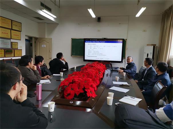 Teo教授做了题为《Switching Time and System Parameter Optimization in Nonlinear Switched Time-Delay Systems》的学术报告。Teo教授围绕非线性时滞系统中未知时滞(状态和输入时滞)和未知系统参数的估计问题进行展开。Teo教授首先介绍了求解动态优化问题中成本函数偏导数的两种计算方法。随后通过将这些计算过程与基于梯度的标准优化算法相结合,得到了未知时滞和系统参数的最优值。利用所提出的方法,Teo教授给出了一些实际应用实例。最后Teo教授就报告内容以及开展学术合作、访问交流,与参会教师进行了探讨。