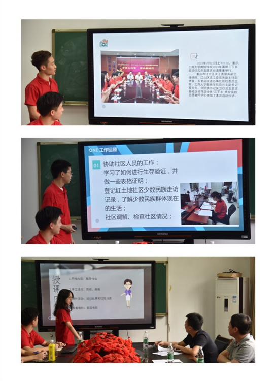 会议开始,主持人吴卫老师对本次“三下乡”活动进行了简要介绍。紧接着,通过一段短视频,大家回顾了“三下乡”社区调研、挂职、授课等工作历程。然后,授课组、挂职组和调研组分别作了工作汇报,他们通过图片展示了各组的工作内容和实践成果,同大家分享了他们参加“三下乡”的心得体会,同时也谈到了工作中需要改进的地方。其中,挂职组的代表说,他从这次实践中懂得了珍惜同学间的友谊,懂得了团队意识是成功的重要因素,懂得了与他人沟通交流的重要性。授课组的代表认为假期的授课活动让她可以奉献出自己的爱心,可以走出大学校园的象牙塔,走到社会中去,让自己的综合能力得到提高。
