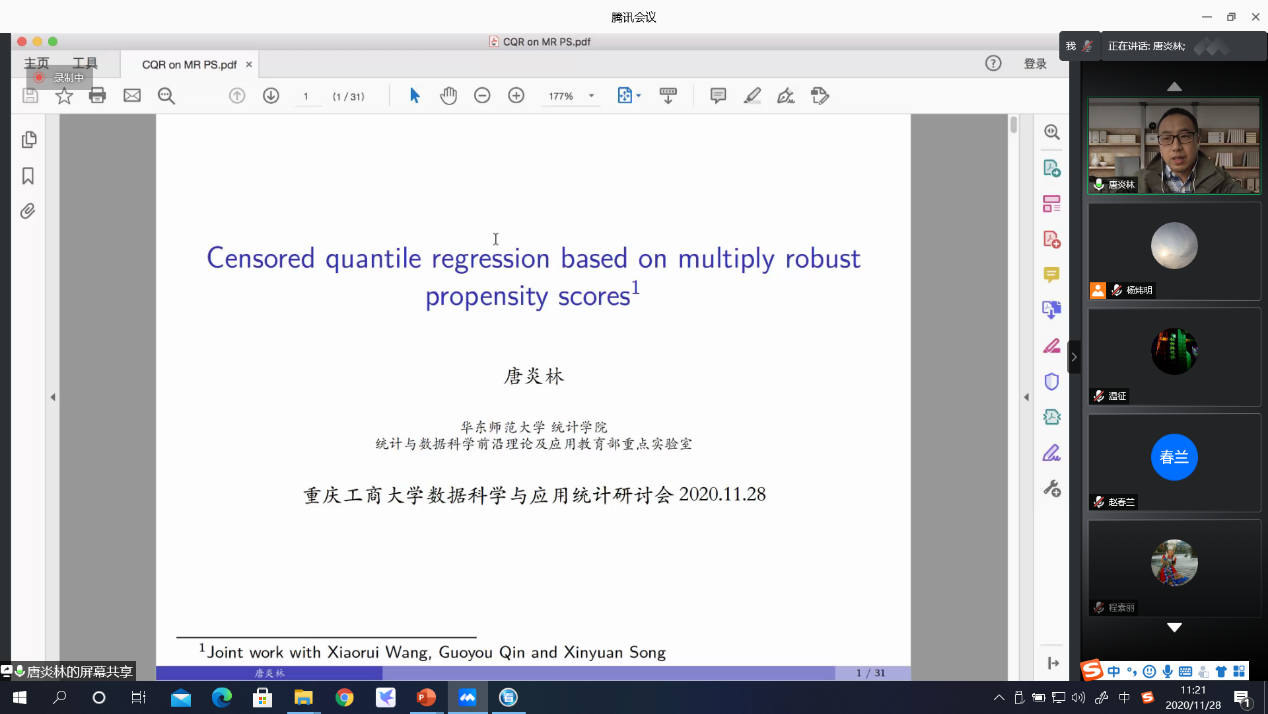 2020年11月28日,为了加强统计学者之间的学术交流,展望数据科学和统计学的发展前景,经济社会应用统计重庆市重点实验室、ok138cn太阳集团,太阳集团tyc9728,44118太阳成城集团、重庆市统计学会联合举办了数据科学与应用统计线上研讨会。此次研讨会非常荣幸地邀请到了上海财经大学尤进红教授、北京师范大学吕光明教授、福建师范大学陈建宝教授和华东师范大学唐炎林研究员进行学术报告,分享最新的研究成果。ok138cn太阳集团,太阳集团tyc9728,44118太阳成城集团陈义安院首先为此次会议致词,对参会人员表示热烈的欢迎,并介绍了学院的发展情况。会议由副院长叶勇和市重点实验室主任杨炜明主持