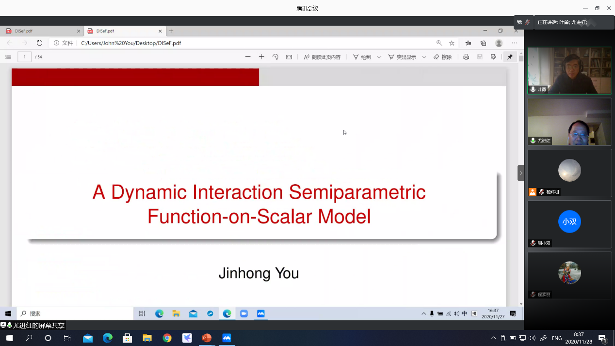 会上,尤进红教授分享了题为“A Dynamic Interaction Semiparametric Function-on-Scalar Model”的研究报告。研究提出了一类动态交互的半参数函数对标量模型,这个模型有助于探索一组协变量与对函数型响应变量效应之间的动态相互作用,研究还探讨了估计的大样本性质,提出了动态交互效应的检验统计量。