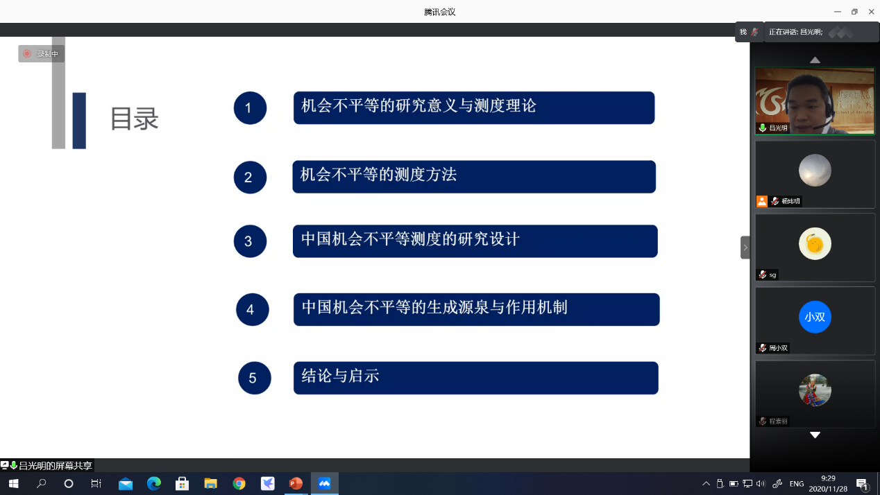 吕光明教授进行了题为“机会不平等的测度方法与中国实证”的报告,吕教授首先梳理了机会平等的内涵和实现原则等测度理论,然后归纳剖析直接测度法、间接测度法、随机占优法和基准测度法四类方法的基本原理,再后结合CGSS2008、2010、2013与2015数据,采用事前参数法测度出中国机会不平等的生成源泉和作用渠道信息,最后结合相关结论,提出以消减机会不平等为突破口的中国收入分配改革建议。