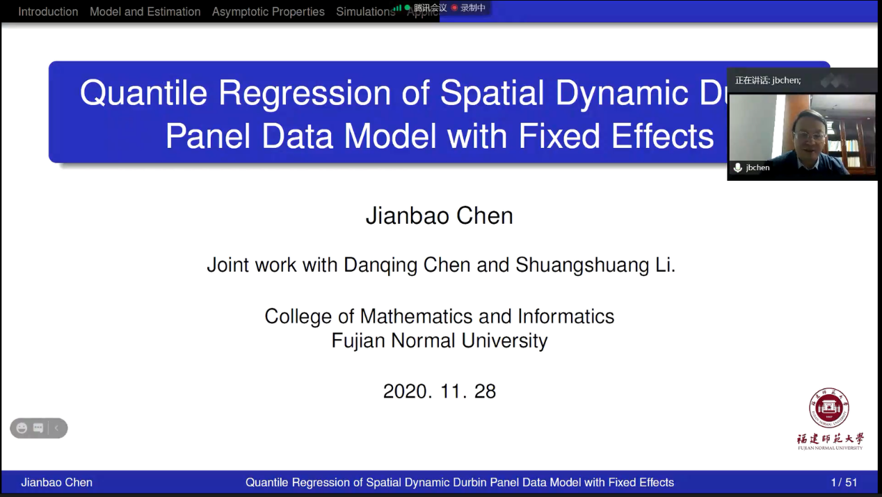 陈建宝教授在题为“nstrumental Variable Quantile Regression of Time-space Dynamic Durbin Panel Data Model with Fixed Effects”的研究报告中,提出了具有固定效应的时空动态Durbin面板数据模型的工具变量分位数回归估计。在一定的正则条件下,得到了估计量的大样本性质。蒙特卡洛仿真结果表明,该估计器在有限样本的不同分位数点上表现良好。并对我国31个省份国际旅游外汇收入的影响因素进行了实证分析。