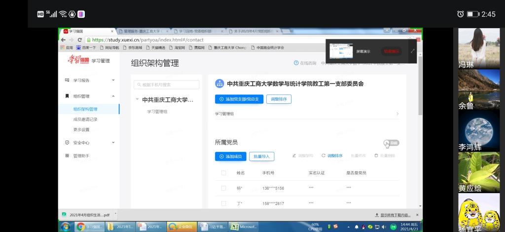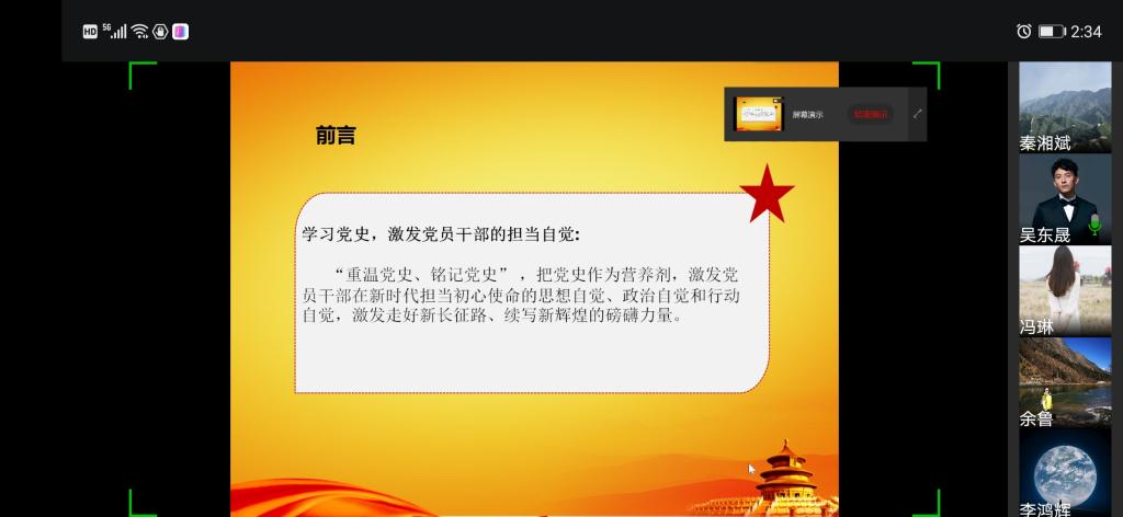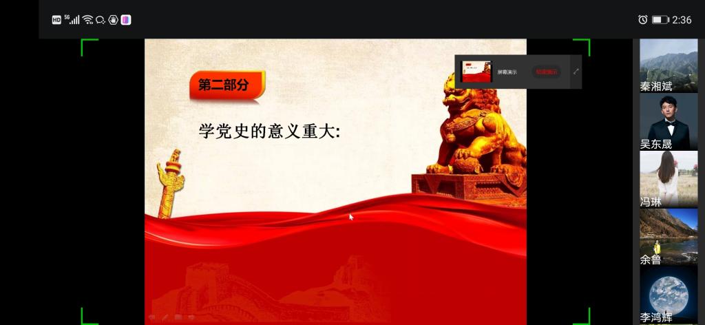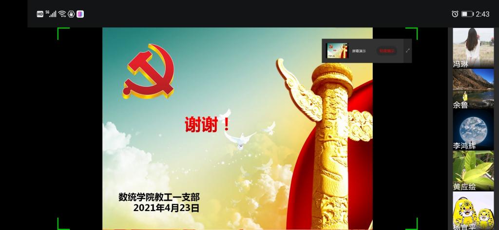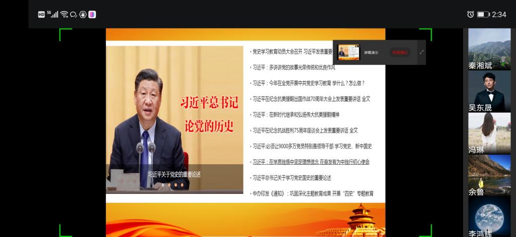 2021年4月23日,在伟大的中国共产党成立一百周年这个极具历史意义事件的背景下,ok138cn太阳集团教工一支部全体党员提高政治站位,以企业微信线上学习的方式,开展支部书记讲党史专题党课并组织党史集中学习研讨,学习活动由支部书记余鲁主持,教工一支部全体党员参加。