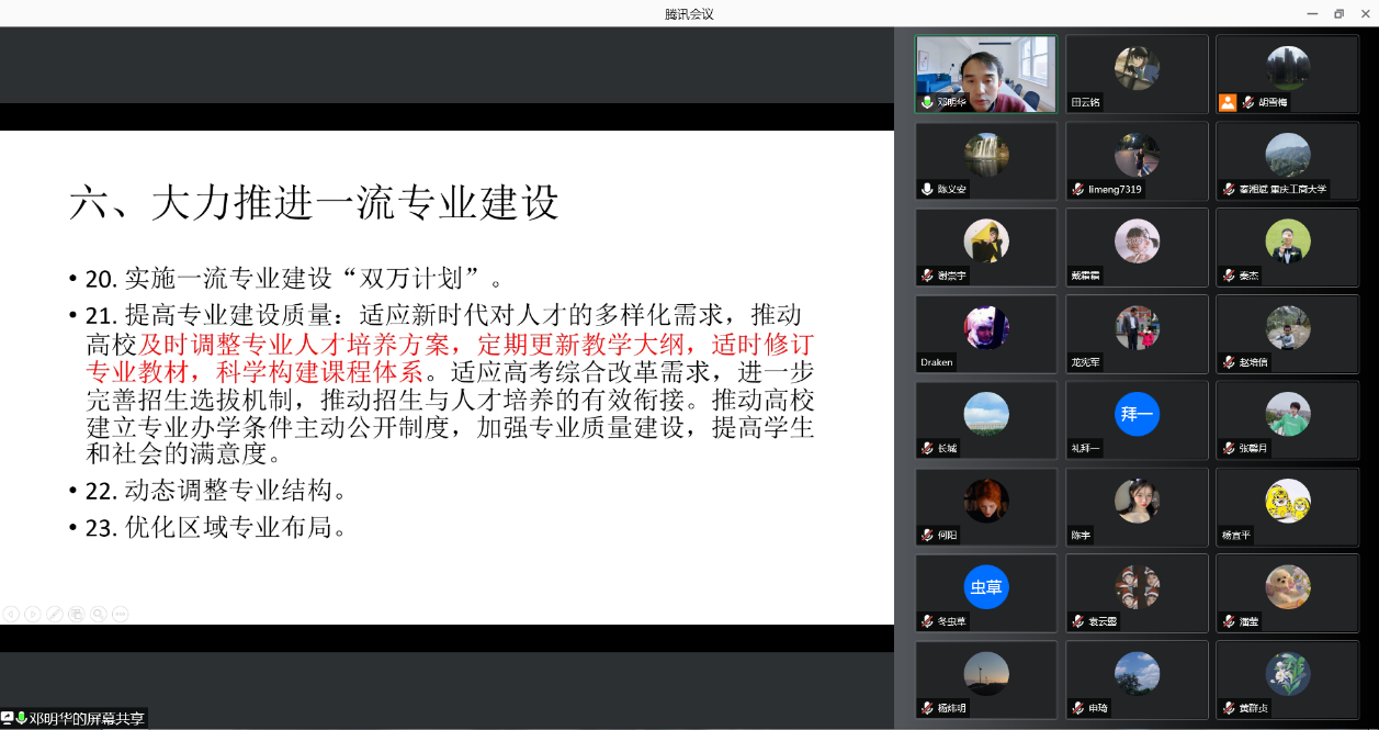 邓明华教授的报告主要介绍国家一流本科专业建设的相关文件,回顾统计学本科教育历史和现状,介绍相关学校的一流专业建设经验,最后针对统计专业建设提出几点思考。报告后学院老师与邓明华教授就统计学国家一流专业的申报和建设情况进行了深入交流。邓教授的报告给统计学一流专业建设指明了方向,提供了宝贵的建设经验和有益的发展措施,参会老师获益匪浅。