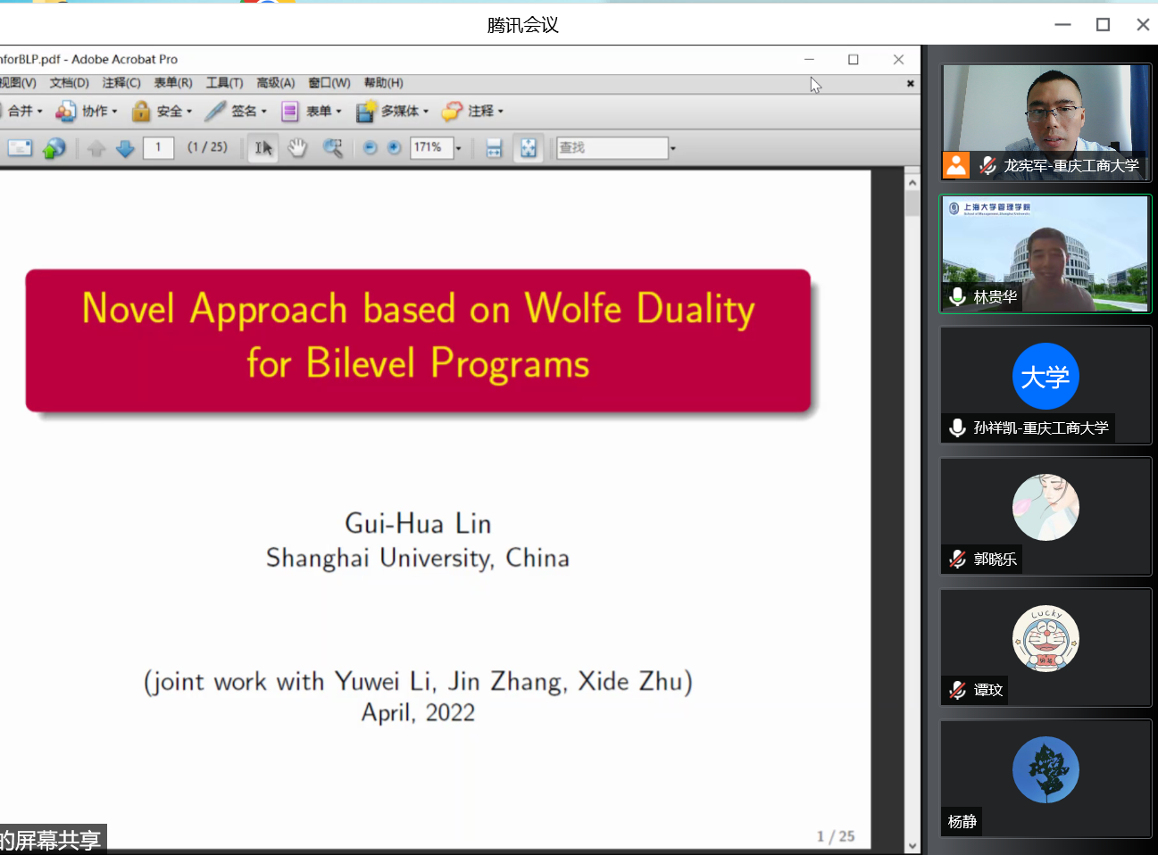 2022年4月21日上午,上海大学林贵华教授为我院师生做了题为《A novel approach for bilevel programs based on Wolfe duality》的线上学术报告。本次报告由数统学院副院长龙宪军教授主持,学院部分老师以及研究生参加了此次学术报告。