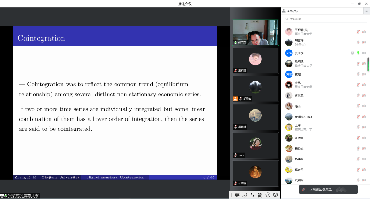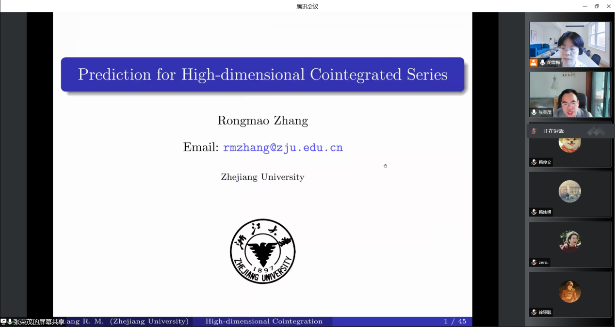2022年5月9日上午9:00-10:30,浙江大学数学科学学院张荣茂教授应胡雪梅教授邀请,为ok138cn太阳集团,太阳集团tyc9728,44118太阳成城集团的师生作了题为《Prediction for High-dimensional Cointegrated Series》的精彩学术报告。学术报告由ok138cn太阳集团胡雪梅教授主持,数据科学系袁利军、杨宜平、赵培信、杨炜明、陈明镜、秦湘斌和许晓曾等青年骨干教师和部分研究生参加了报告会。