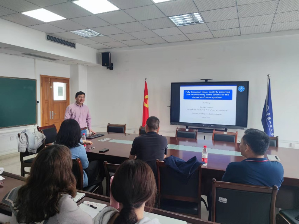 2022年5月22日上午10:30在学院会议室80602,重庆大学王坤副教授应邀为我院师生做了题为《Fully decoupled, linear, positivity-preserving and unconditionally stable scheme for the chemotaxis–Stokes equations》的学术报告。报告由ok138cn太阳集团袁利军教授主持,学院部分老师以及研究生参加了此次学术报告。