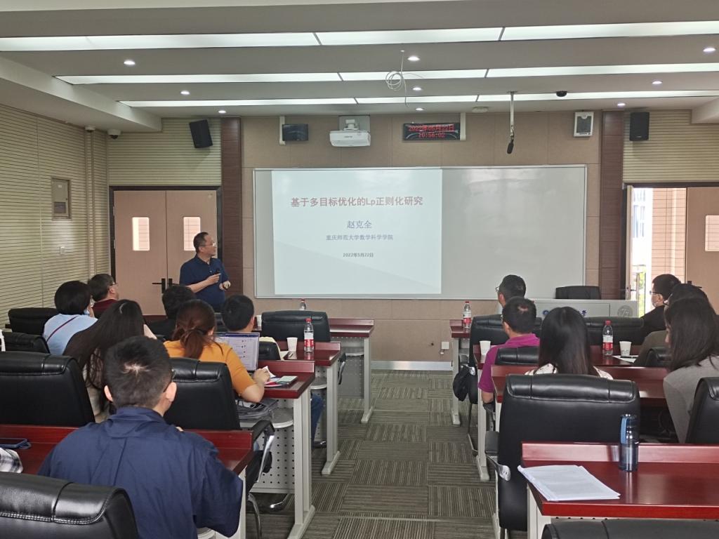 赵克全教授做了题为《基于多目标优化的Lp正则化研究》的学术报告。赵教授首先介绍了其团队最近关注的问题;然后简要介绍Lp正则化研究的背景与最新进展;最后基于多目标优化思想和标量化方法,提出一类处理Lp正则化问题的新方法;最后给出了数值实验阐明了算法的优势。