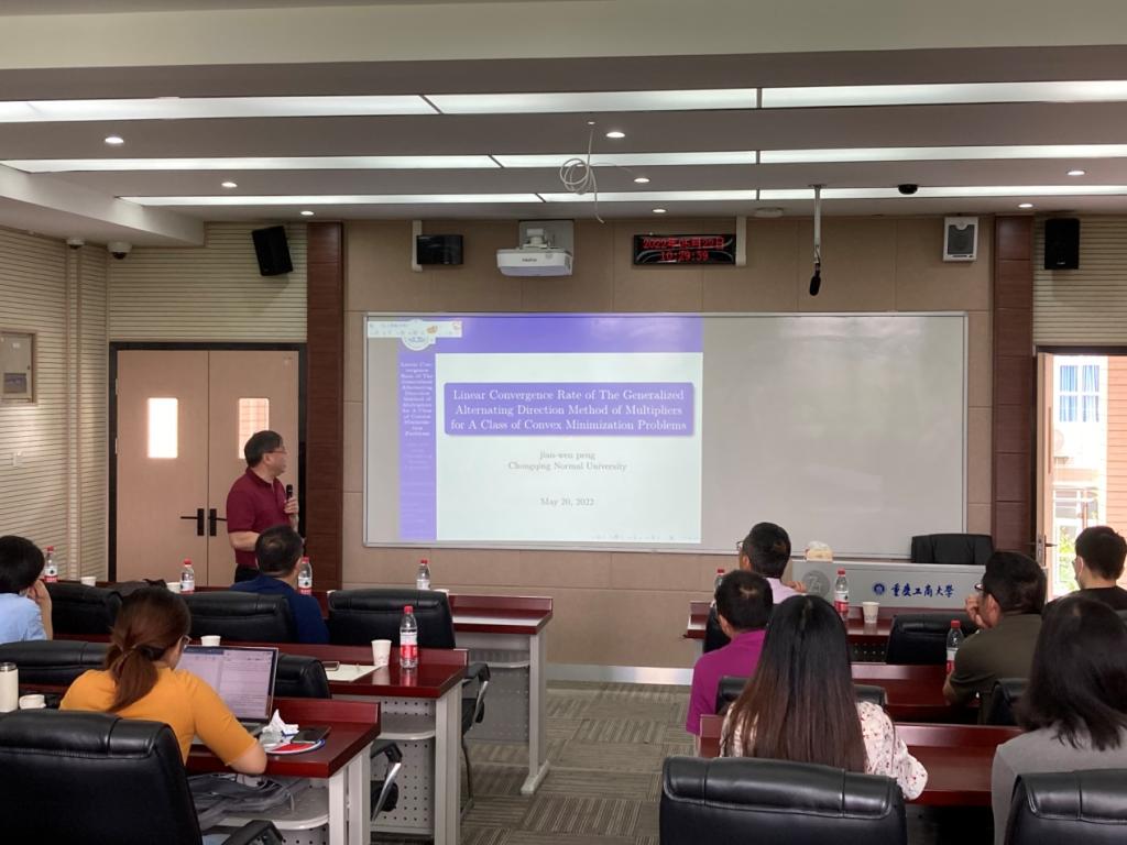 2022年5月22日上午,数统学院举办了最优化理论与算法小型学术研讨会。主讲人为重庆大学的李声杰教授、重庆师范大学的彭建文教授和赵克全教授。会议由学院副院长龙宪军教授主持,孙祥凯教授、李高西副教授、曾静副教授、李耿华副教授、黄应全老师以及研究生参加了此次学术研讨会。
