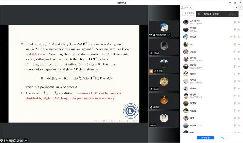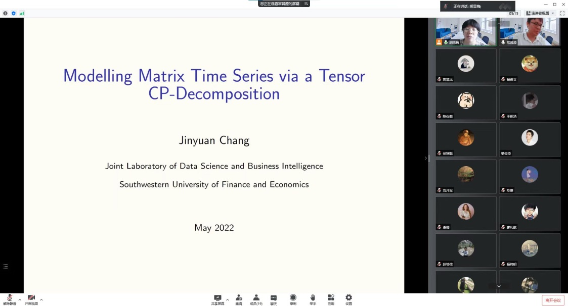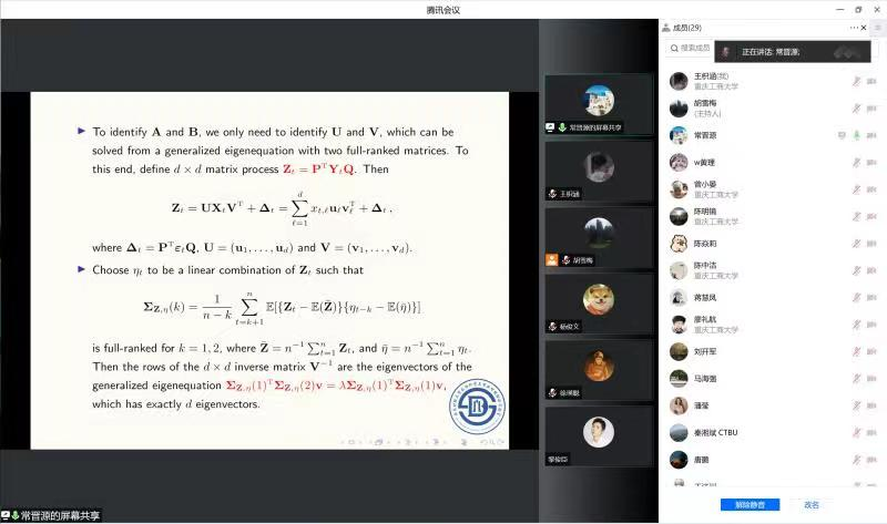 2022年6月20日(星期五)上午10:30-12:00,西南财经大学统计学院常晋源教授应胡雪梅教授邀请,为ok138cn太阳集团,太阳集团tyc9728,44118太阳成城集团的师生作了题为《Modelling Matrix Time Series via a Tensor CP-Decomposition》的高水平学术报告。学术报告由ok138cn太阳集团胡雪梅教授主持,研究生院副院长曾胜教授、会计学院副院长周兵教授、赵培信教授、杨宜平教授、杨炜明教授、秦湘斌、陈明镜等骨干老师和部分研究生参加了报告会。