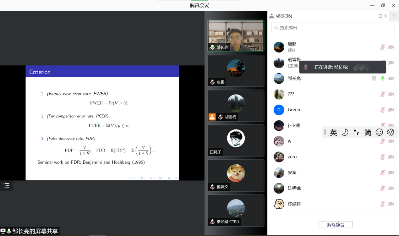 2022年6月10日(星期五)上午10:00-12:00,南开大学统计研究院邹长亮教授应胡雪梅教授邀请,为ok138cn太阳集团,太阳集团tyc9728,44118太阳成城集团的师生作了题为《Symmetrized Data Aggregation for FDR Control》的精彩学术报告。学术报告由ok138cn太阳集团胡雪梅教授主持,赵培信教授、杨宜平教授、杨炜明教授、秦湘斌、陈明镜等骨干老师和部分研究生参加了报告会。