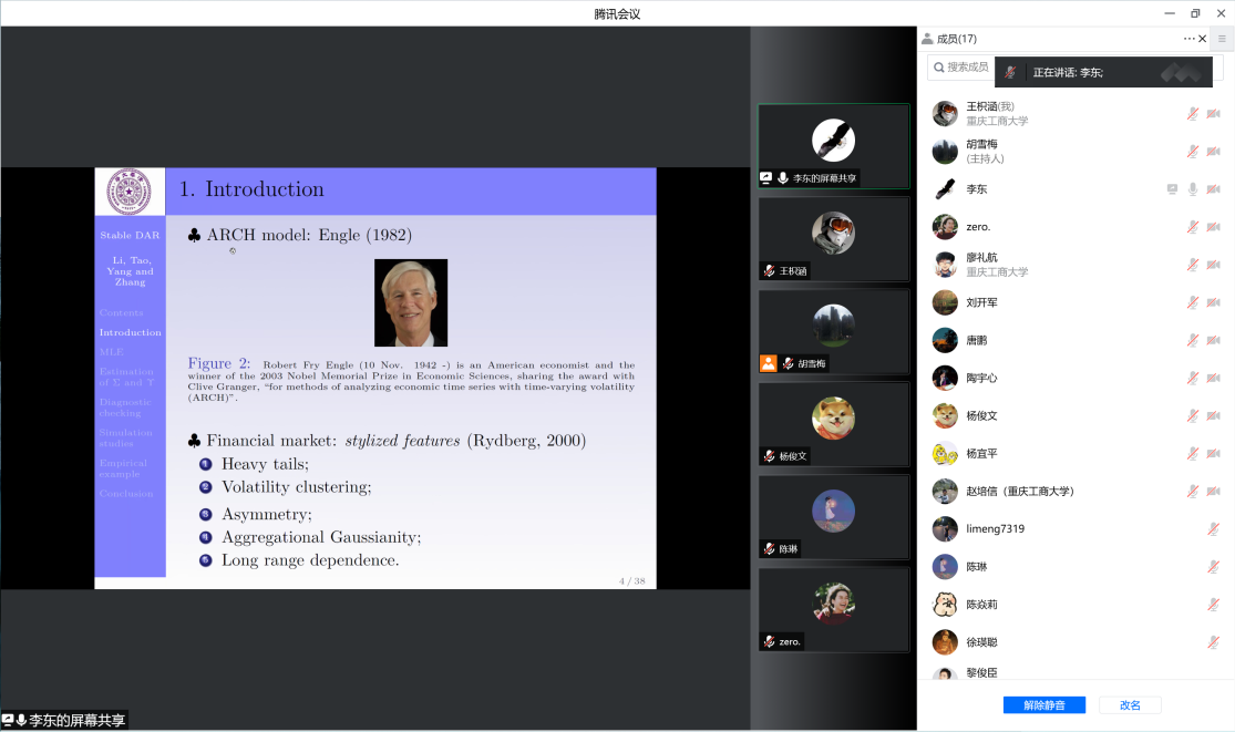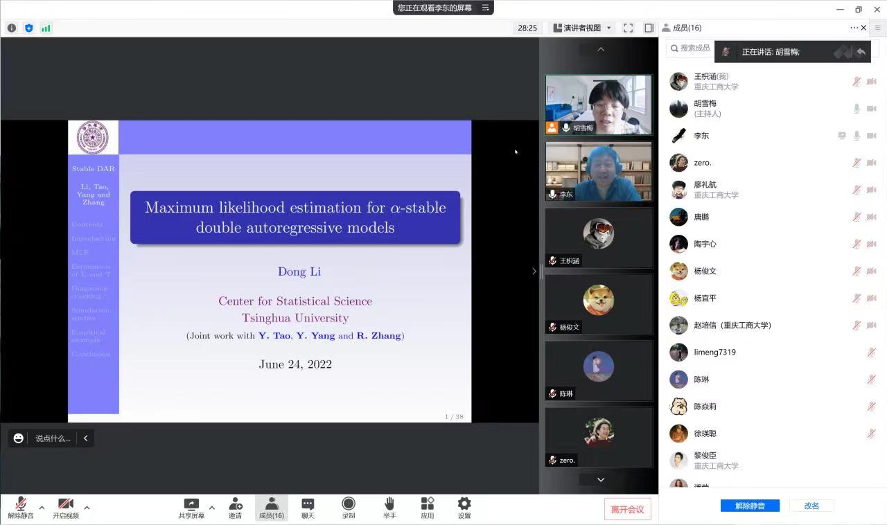 2022年6月24日星期五上午10:30,清华大学统计学研究中心李东副教授应胡雪梅教授邀请,为ok138cn太阳集团,太阳集团tyc9728,44118太阳成城集团的师生作了题为《Maximum likelihood estimation for alpha-stable double autoregressive models》的高水平学术报告。学术报告由ok138cn太阳集团胡雪梅教授主持,赵培信教授、杨宜平教授、程素丽博士等骨干老师和部分研究生参加了报告会。
