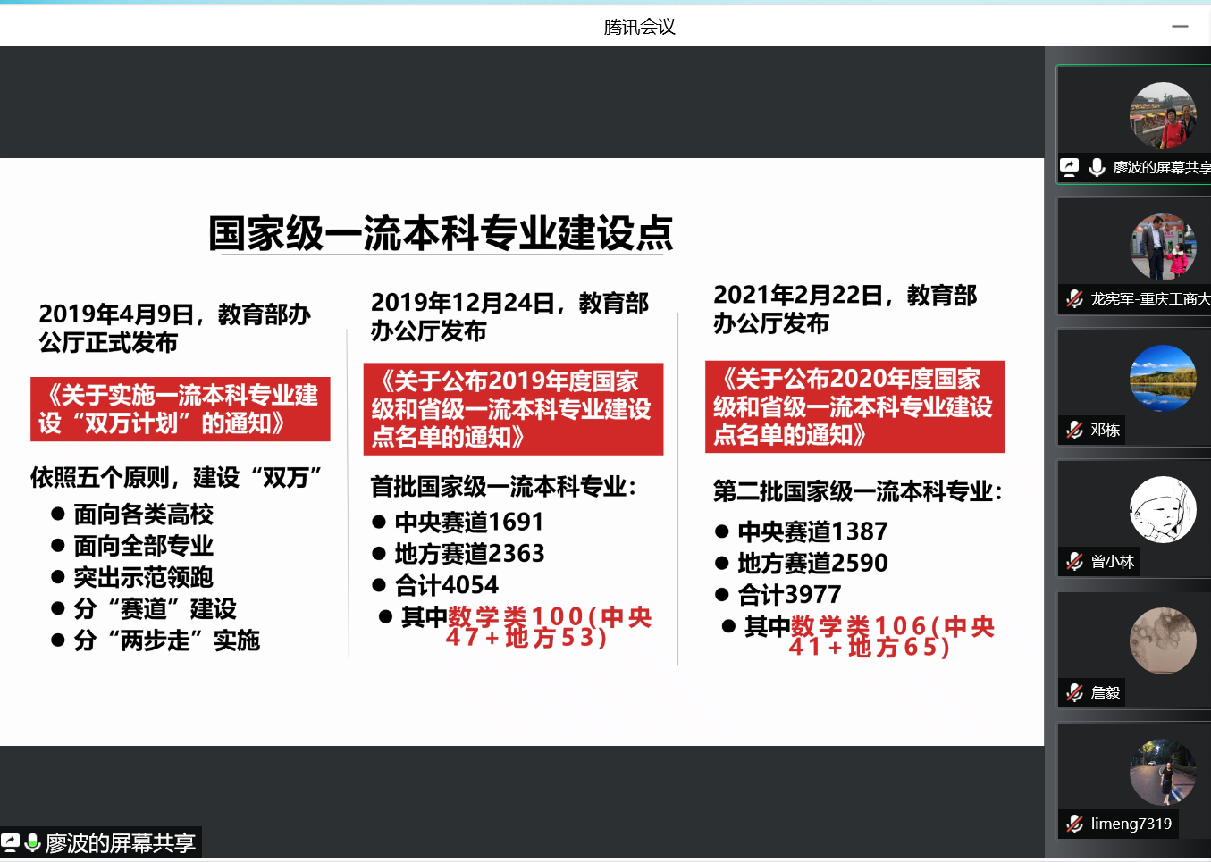 2022年7月5日上午,海南师范大学廖波教授为我院教师做了题为《国家一流专业建设评选与评估标准》的报告。本次报告由数统学院副院长龙宪军教授主持,学院部分老师参加了此次报告。