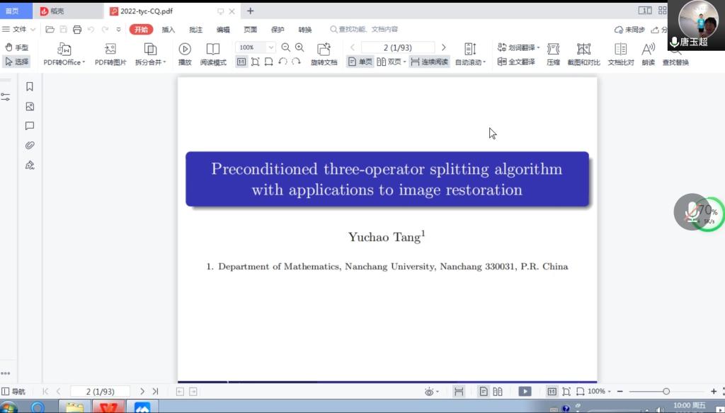 2022年07月08日上午,南昌大学唐玉超教授应邀为我院师生做了题为《Preconditioned three-operator splitting algorithm with applications to image restoration》的线上学术报告。本次报告由ok138cn太阳集团副院长龙宪军教授主持,学院部分教师以及研究生参加了此次学术报告会。
