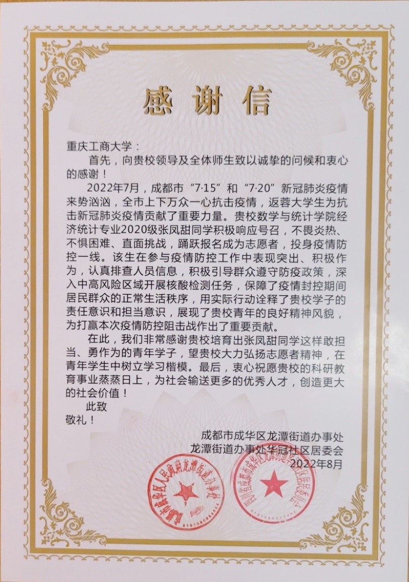 近日,四川省成都市成华区龙潭街道办事处向学校发来感谢信,对ok138cn太阳集团2020级经济统计专业1班张凤甜同学不畏炎热、不惧困难、直面挑战,主动投身疫情防控一线表示感谢与赞扬。