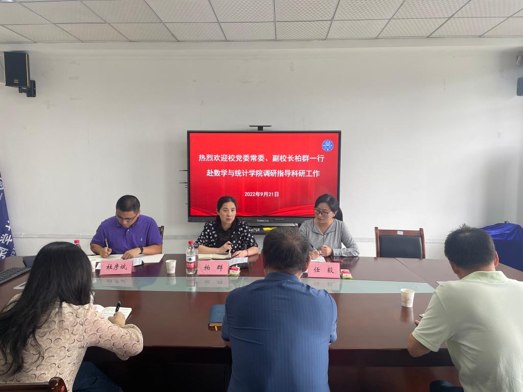 柏群针对学院科研工作现状及科研项目申报提出了几点要求和建议,她提到学院要处理好“质”与“量”的关系,既要在国家基金项目申报数量上实现突破,又要不断提高科研项目申报质量,注重数学、统计方法在各领域的应用及学科交叉融合等申报方向,组织专家团队进行科研项目申报指导,进一步提升国家基金项目中标率;要全面发力、重点突破,不断拓展思路、开阔视野、统筹组织,加强学科专业建设,提高人才引进质量,做好科研项目申报分类引导,鼓励青年教师积极申报教育部后期项目及国家社科基金后期项目,激发教师科研热情,提高教师科研能力;要严守纪律、勇担责任,积极关注教职工思想动态,做好意识形态工作,同时加强科研团队建设,进一步凝练学科方向,深耕科研,充分利用好学校现有人力资源,加强校际合作,学习好的经验和做法,调动多方力量积极参与科学研究;要在科研机制保障上下功夫,进一步优化科研管理体制,及时为教师提供科研信息咨询,了解教师科研诉求,鼓励教师结合国家政策和地方发展积极申报科研项目,为教师从事科学研究提供制度保障、营造良好环境。