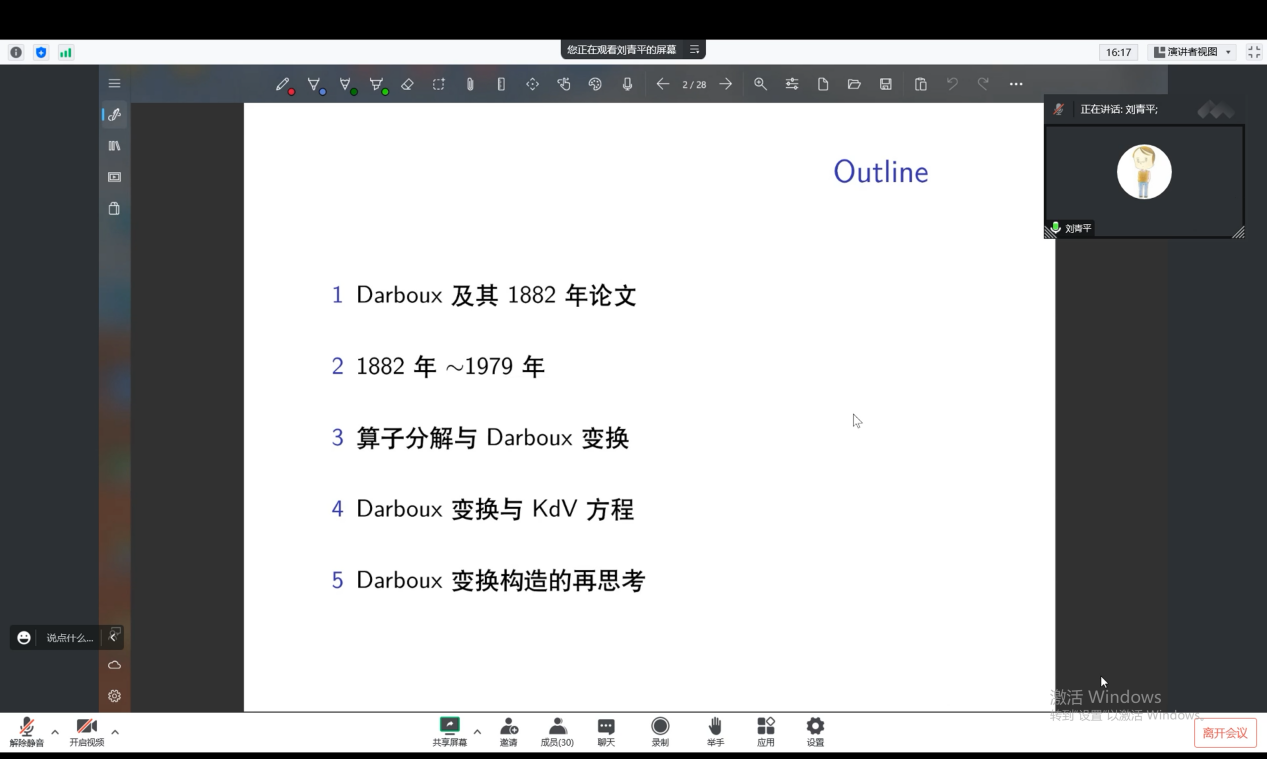 2022年10月27日下午,中国矿业大学刘青平教授应邀为我院师生作了题为《从Darboux的一篇短文谈起》的线上学术报告。本次报告由ok138cn太阳集团院长陈义安教授主持,学院部分教师以及研究生参加了此次学术报告会。
