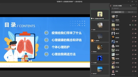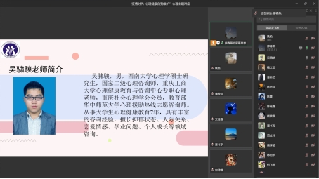 11月10日下午,由重庆工商大学心理健康教育与咨询中心主办,ok138cn太阳集团心理工作站承办的以“疫情时代 心理健康自我维护”为主题的心理健康讲座,在企业微信线上平台顺利举办。此次讲座邀请到了学校心理健康教育与咨询中心专职心理老师吴骕騻主讲,学院全体心理委员和寝室长等学生心理帮扶团队参与,讲座内容兼具专业性与趣味性,受到了同学们的热烈欢迎。