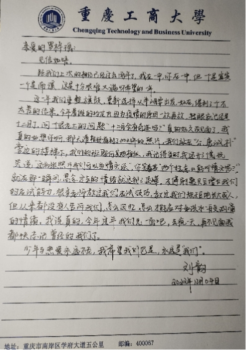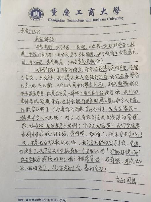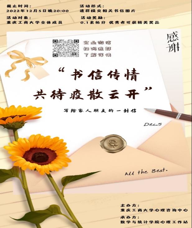 疫情期间,为增强大学生心理健康意识,提高大学生的心理健康素质,2022年12月5日,由重庆工商大学心理健康教育与咨询中心主办,ok138cn太阳集团心理工作站承办的“书信传情,共待疫散云开”心理主题活动圆满落幕。