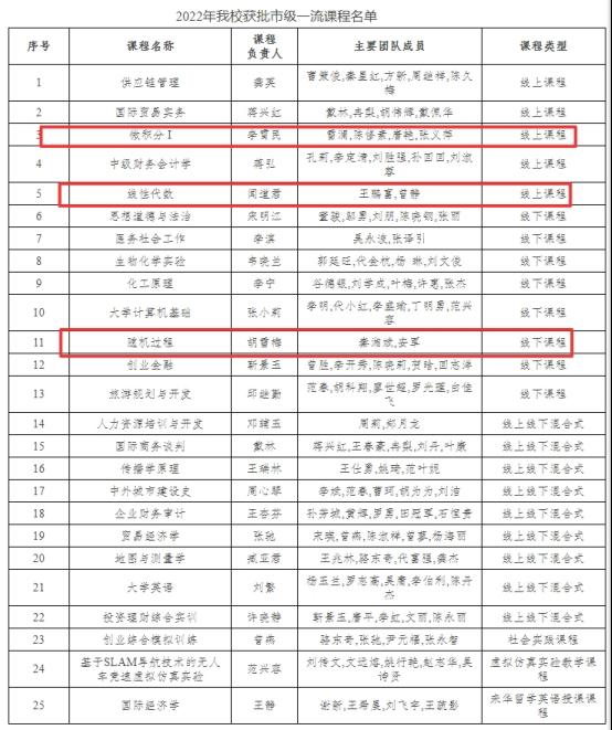 近日,重庆市教育委员会公布2022年重庆市高校一流本科课程名单和一流本科课程示范案例评选结果,我校获批市级一流本科课程25门,我院微积分 I、线性代数、随机过程名列其中,到目前,全院有市级一流课程4门,校级一流课程7门。