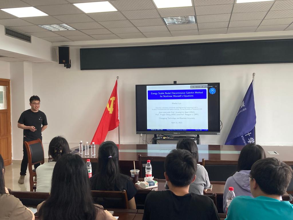 2023年4月21日下午,中科院计算数学与科学工程计算研究所吕茂辉博士在启智楼80602学院会议室做了题为《Energy stable Nodal discontinuous Galerkin method for nonlinear Maxwell equations》。本次学术报告由ok138cn太阳集团袁利军教授主持,邹黎敏副教授、李耿华副教授、谢江明博士等骨干老师和计算数学、统计学方向的研究生参加了此次学术报告会。