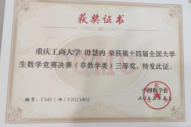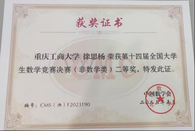 重庆工商大学学子在2023年第十四届全国大学生数学竞赛决赛(非数学组)中夺得佳绩,创近五年来记录。本届决赛及颁奖大会于2023年5月26日-5月28日在广东工业大学举行。我校徐思杨、毋慧冉同学分获全国二等奖、全国三等奖。