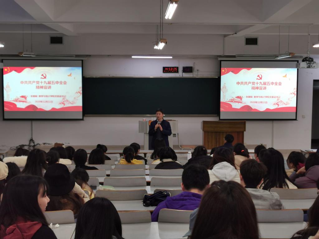 随后张朝毅副书记结合毕业实习与毕业论文对十九届五中全会精神进行了宣讲。张书记讲到,随着科级的不断进步,加之疫情影响,就业岗位需求减少,而毕业生数目又只增不减,未来同学们面临的挑战会越来越大,考研压力也会越来越大。但他仍然对大家充满信心,同时对部分同学能够坚定信念、克服困难选择考研表示了高度的赞扬。他说:“你们放弃了随遇而安,选择勇往直前,选择考研的你们是最棒的!”除此之外,他还不忘提醒同学们要重视疫情防控,保护好自身安全。