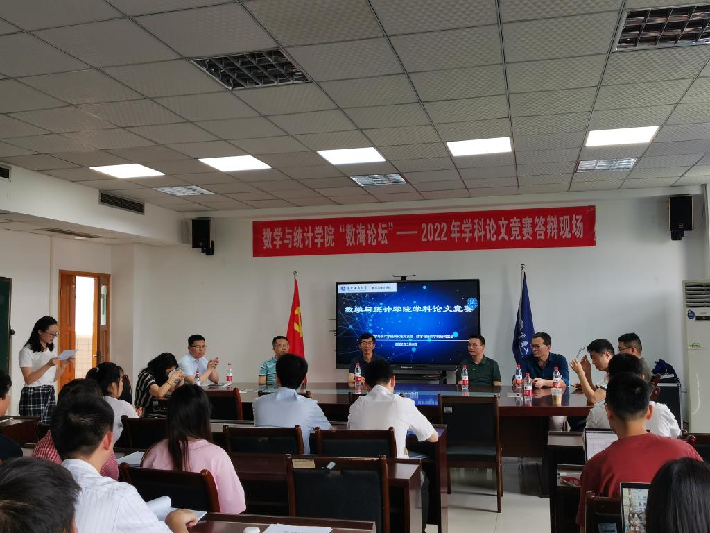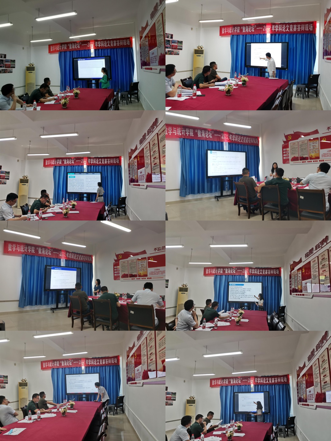 答辩赛分数学学科组和统计学科组,各参赛队伍将自己的参赛论文依次进行PPT展示和答辩。评委老师就选题的新颖程度、方法的灵活应用、模型构建的创新点等各个方面进行了精彩的点评。最后,《基于相关性分组的Vine-Copula模型的股票市场风险度量》(刘明成)、《基于 CEEMD 小波去噪的一种预测碳排放的新方法》(王斯、杨澈洲、张国浩)获得统计学科组一等奖,《A new variance-based subgradient extragradient algorithm with line search for stochastic variational in equalities》(贺月红、杨静)、《求解非单调变分不等式的两类投影算法》(方珍洁、王霄婷)获得数学学科组一等奖。