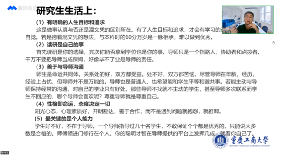 然后继续分享了论文选题、参考文献等相关方面的的心得,点明研究生与导师之间密切交流的必要,以及如何快速进入科研状态。