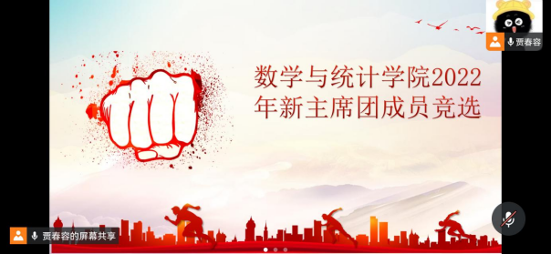 随后,由数统学院研分会副主席贾春容介绍本届参加新任研分会主席团人员竞选的同学名单。本着公平、公正、公开的原则,各位竞选者依次发表竞选演讲并回答随机抽取的问题,随后由参会人员共同投票选出,最终李朝衡、任莹莹、罗瑞欣当选为数统研分会主席团成员,李志任组织部部长。