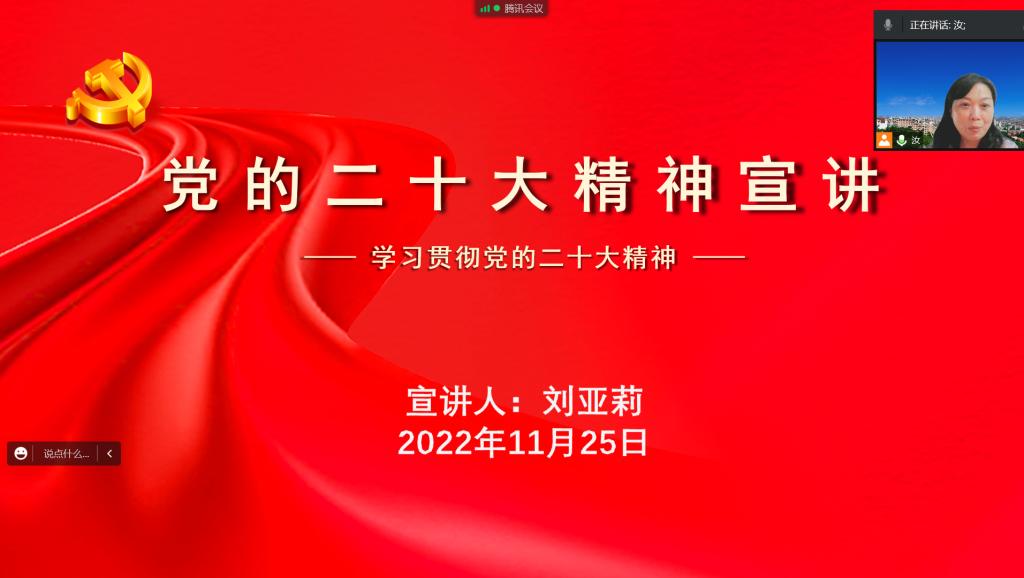 学习宣传贯彻党的二十大精神是当前和今后的首要政治任务。为更加深刻全面的理解二十大精神,2022年11月25日晚,ok138cn太阳集团在线上举行党的二十大宣讲教育活动,此次活动由ok138cn太阳集团党委委员刘亚莉主讲,ok138cn太阳集团全体研究生参加活动。