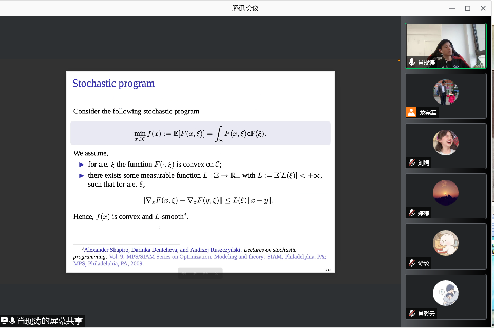 2022年1月7日下午,大连理工大学肖现涛副教授为我院师生做了题为《Unified Convergence Analysis of Stochastic Bregman Proximal Gradient and Extragradient Methods》的线上学术报告。本次报告由学院副院长龙宪军教授主持,孙祥凯、李高西、曾静、李耿华等老师以及研究生参加了此次学术报告。