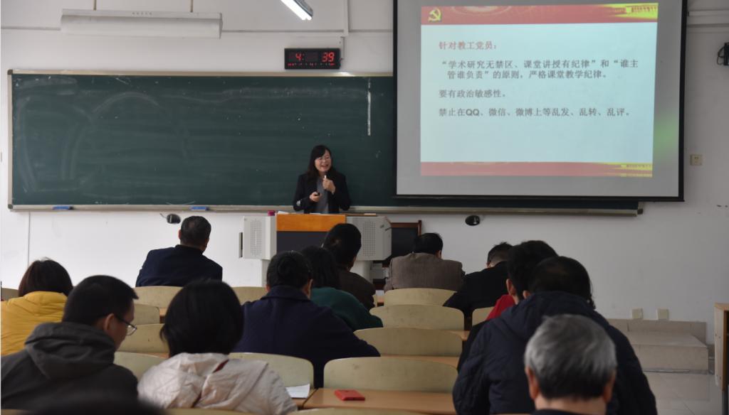 喻书记首先以“把纪律和规矩挺在最前面”为题给教工党员做了专题党课,喻书记特别强调了政治纪律和组织纪律的重要性,从“两个维护”出发要求党员同志严守纪律规矩,争做合格党员。接下来喻永红书记从党的路线、党的团结统一、党与群众的关系、党的纯洁性和先进性四个方面介绍了加强党的纪律的重要性,并从对《党章》的对照学习、树立党员的《党章》意识、自觉坚守党的纪律、模范遵守党纪校规、教学科研管理发挥表率作用等方面对教工党员提出了要求,希望大家从严要求自己,永葆党员的政治本色。