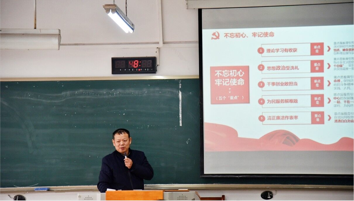 紧接着,陈院长从高品质生活、新时代共产党员的素质、学校的管理制度建议以及如何提高教学质量这四点阐述了“不忘初心,牢记使命”主题教育学习的重要意义。他强调学院建设要围绕“找差距,抓落实”展开,有针对性地开展工作,将口号转化为实际行动,反对形式主义与官僚主义,加强院际联系,努力实现数学与统计的学科交叉融合。他提到中共党员应该加强理论学习,坚定理想信念,并强调了“四个意识”“四个自信”对个人发展和学院工作的重要性。要求教师党员要深入进行科学研究,达到学科科研指标,在学院工作中起到先锋模范作用,积极推动学院发展。