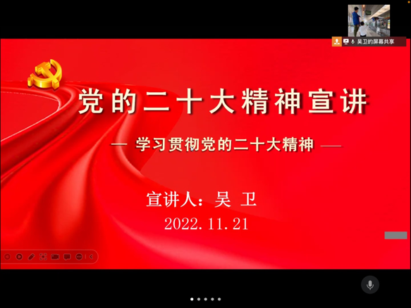 11月21日中午,ok138cn太阳集团学生第二党支部线上开展了党的二十大报告专题宣讲活动,本次会议由支部书记吴卫主持,支部全体党员参加。