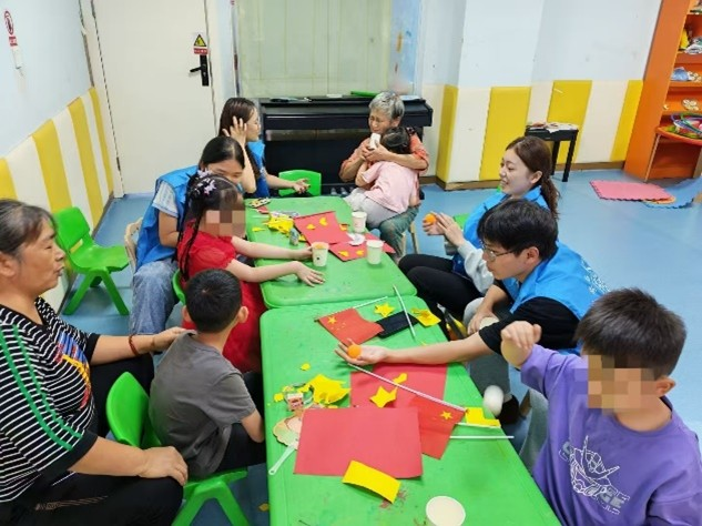活动伊始,志愿者们便以亲切的笑脸和轻柔的言语走近孩子,迅速消融了初见的陌生。在“接乒乓球”互动环节,面对肢体协调欠佳的儿童,志愿者俯身引导、耐心鼓励,孩子们从怯懦尝试到成功接球,每一点进步都赢得全场真诚的掌声。手工制作环节,一双双小手在大手的帮助下,细心拼贴出一面面鲜艳的五星红旗,爱国情怀在协作中悄然生根。活动在轻松愉快的氛围中进行,笑声与温暖交织,志愿者的身影成为孩子们眼中最可靠的陪伴。