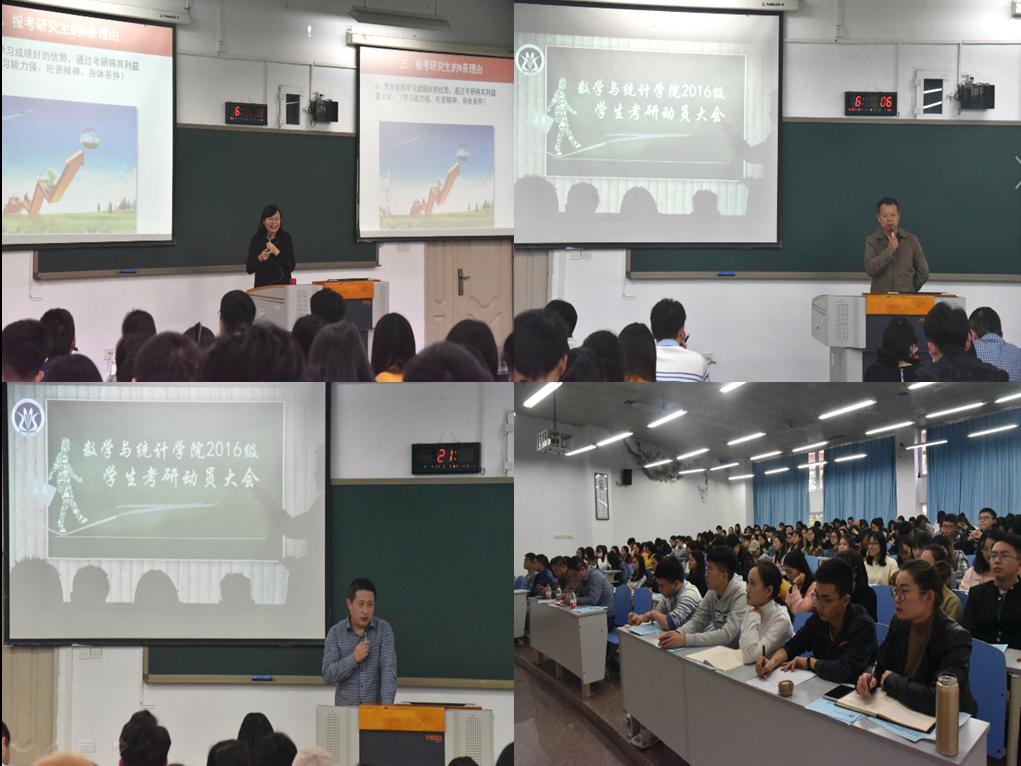 首先,喻书记以“欲穷千里目,更上一层楼”为题,她详细地分析当前我国就业形势和社会对人才需求的变化,提出报考研究生的九大理由,面向全体16级本科生进行动员,鼓励同学们积极报考,认真准备,力争人生“更上一层楼”。随后,陈院长根据2016级学生提出的考研疑问,主要从择校、择专业、我院研究生专业设置和招生情况、如何复习备考等方面进行讲解。他详细地介绍了高校研究生的招生情况,建议同学们报考时要充分结合自己的兴趣爱好、专业能力等因素,综合考量,理性选择。同时,他还为同学们推荐了数学科目的复习教材,建议同学们尽早准备,早做计划。此后,程书记在学校选择、备考时间和备考心态上进行了相关补充并激励同学们摆正心态、不畏苦难、坚持到底。