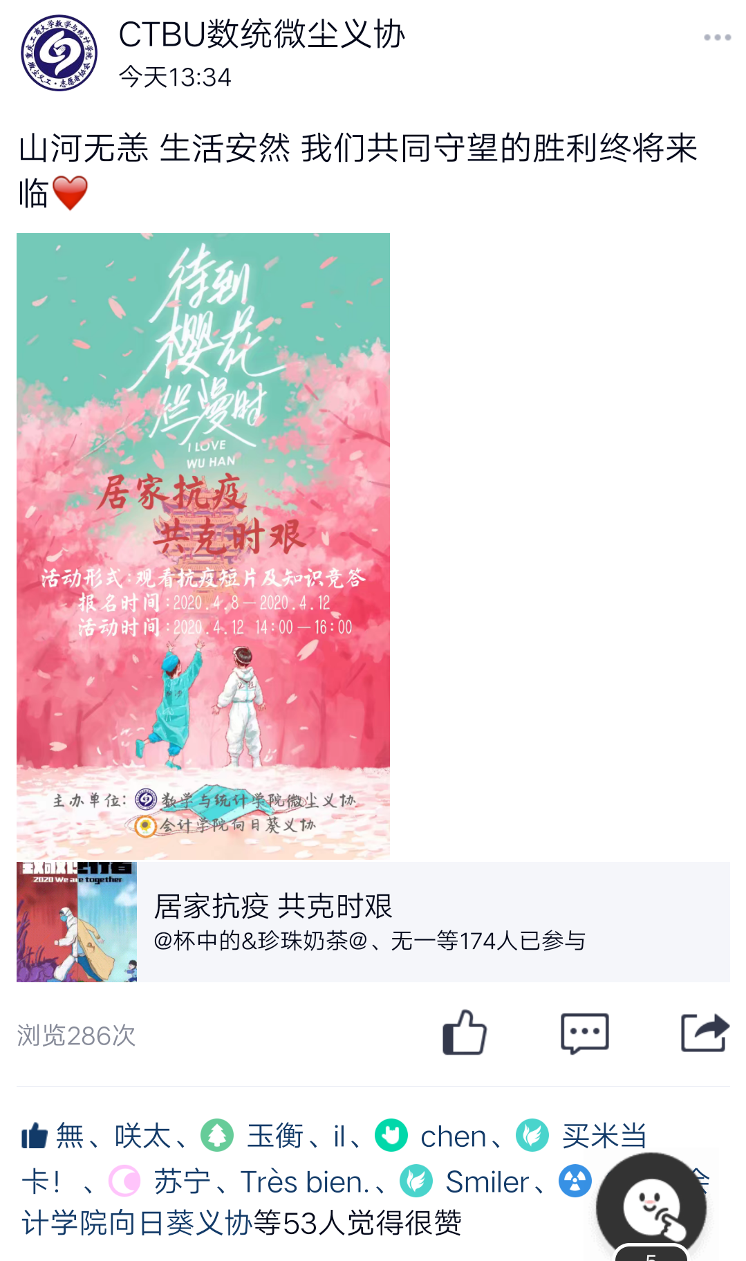 为了增强同学们的抗疫信心,丰富同学们的宅家生活,数统学院分团委和微尘义协分别开展了“数统战“疫”,28天元气打卡计划”和“居家抗疫,共克时艰”线上观影及知识竞答活动。