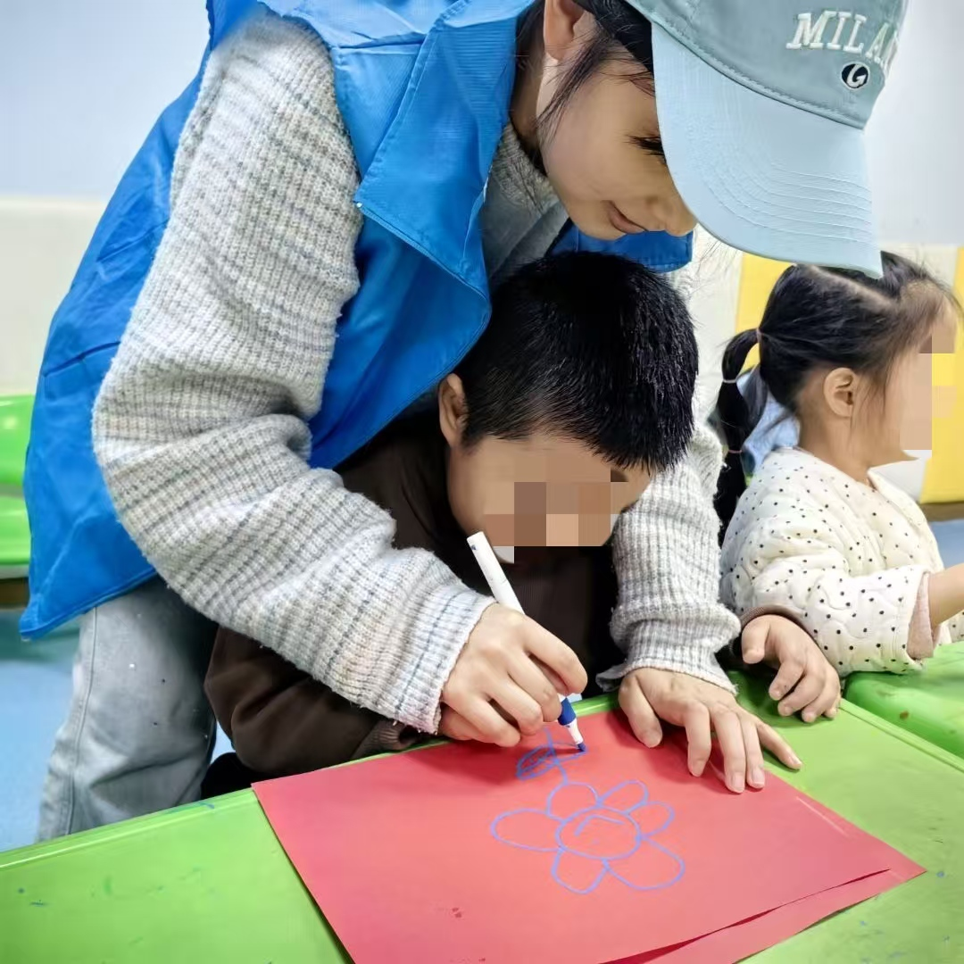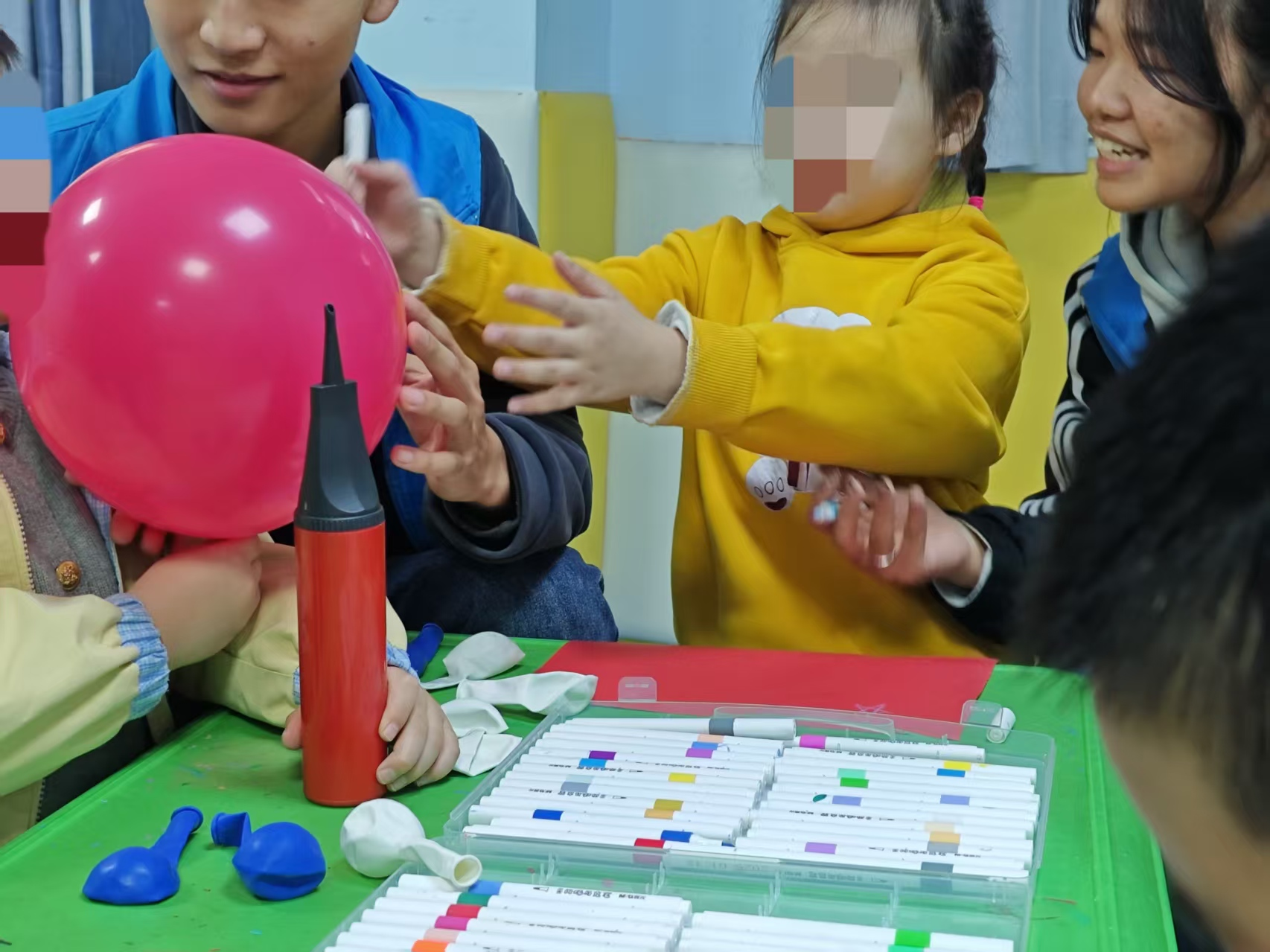 活动中,志愿者们与孩子们亲切互动,通过绘画、手工、游戏等多种形式陪伴孩子们度过了一段温馨时光。在绘画环节,红笺铺展,志愿者轻握孩子的小手,在纸上勾勒花的轮廓。蓝笔游走间,是志愿者的细致引导,亦是孩子眼中闪烁的好奇星光,一笔一画间,悄然织就了一段关于信任与陪伴的美好故事。那抹粉色气球在志愿者的协助下缓缓胀起,孩子雀跃的笑声似风铃声清脆,志愿者的眉眼间满是温柔笑意,这一幕,成了活动室里最动人的风景。