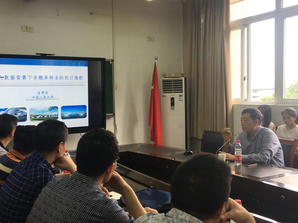 2018年6月11日,我国著名抽样专家,教育部统计学教学指导委员会副主任委员,教育部重点研究基地“应用统计科学研究中心”主任,中国商业统计学会(一级学会)会长,国务院政府特殊津贴获得者,中国人民大学“杰出学者”金勇进特聘教授,在慧智楼90510会议室为我院的统计学老师及研究生做题为“大数据背景下非概率样本统计推断问题”的精彩学术报告。我院相关教师和研究生参加了本次报告会。会议由学院叶勇副院长主持。