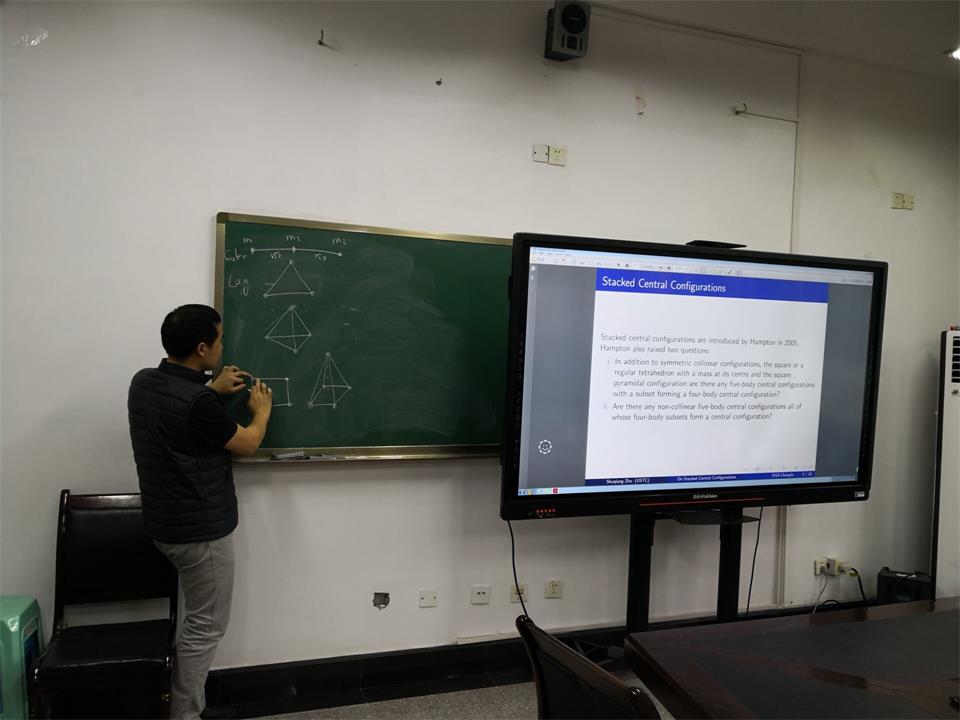 2018年12月13日下午4:00,在ok138cn太阳集团,太阳集团tyc9728,44118太阳成城集团90510会议室,中国科技大学数学科学学院祝书强副研究员应我院邓义杨博士邀请做了题为《On stacked central configurations》的学术报告。祝书强:中国科学技术大学数学科学学院特任副研究员。2010年毕业于四川大学数学学院, 2017年毕业于维多利亚大学,获博士学位。主要从事哈密尔顿动力系统,弯曲空间的N体问题的研究,主要研究文章发表在《Journal of Nonlinear Science》,《Journal of Mathematical Physics》,《Proceeding of American Mathematical Society》, 《Journal of Dynamical System and Differential Equations》, 《Discrete and Continuous Dynamical Systems》上。