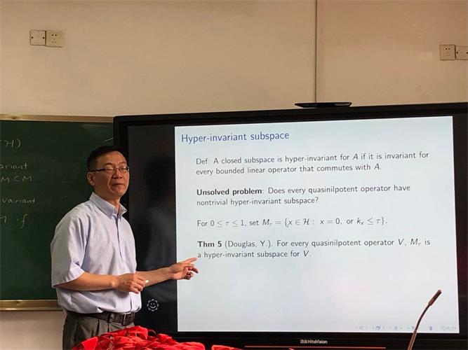 杨教授首先给出了所要研究的非欧式度量,并通过一个有趣的例子形象的给出了圆盘在欧氏度量和非欧度量下的不同,让大家对所研究的非欧度量有了一定的认识,随后杨教授又介绍了拟幂零算子的性质以及不变子空间等相关方面的研究进展。杨教授的报告形象生动,深入浅出,在座的各位老师通过杨教授的报告对非欧度量及不变子空间等问题有了深入了解,受益匪浅。